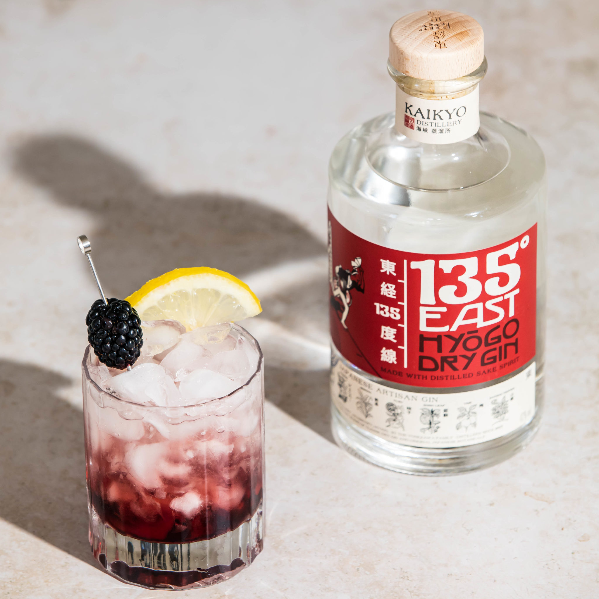 Tumbler mit Crushed Eis füllen, 135° East Gin, Yuzu-oder Zitronensaft und Zuckersirup hinzufügen und vorsichtig umrühren. Langsam in kreisenden Bewegungen den Brombeersirup über das Eis geben und servieren.