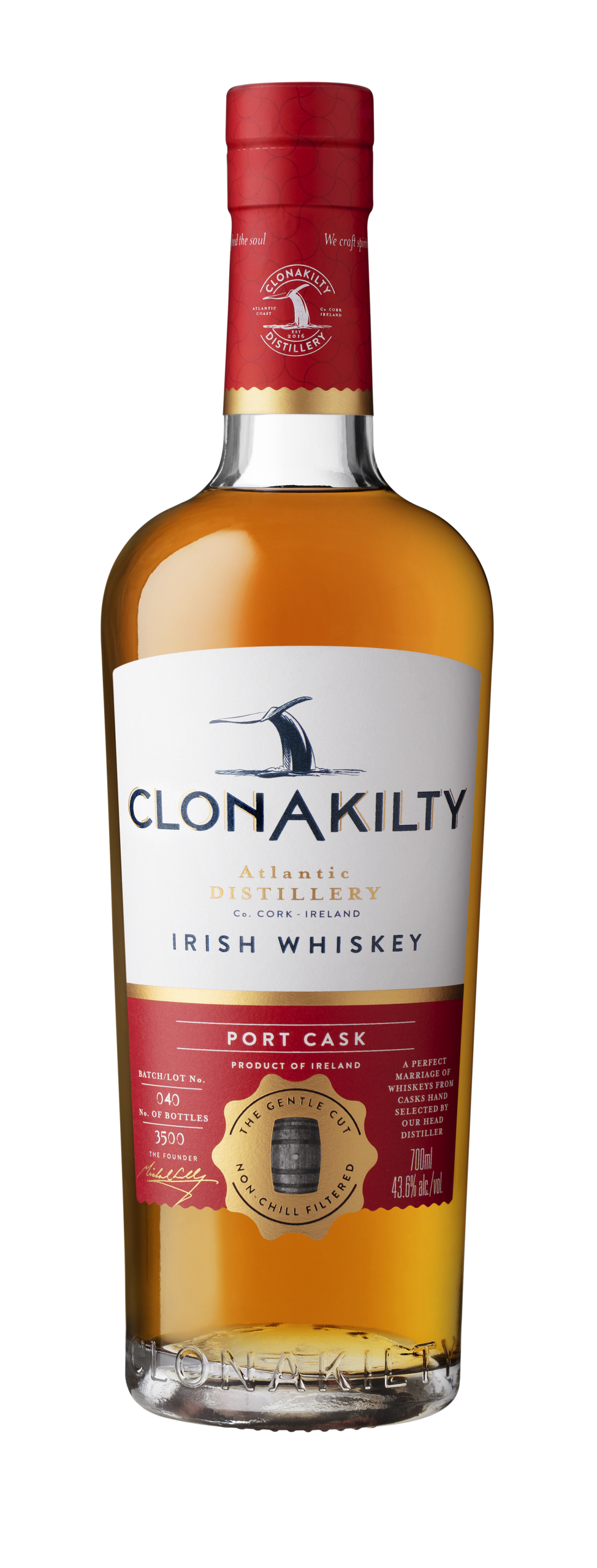 Dieser irische Premium Whiskey entsteht durch die Vermählung zweier Premium Whiskey Destillate bestehend aus 35% des Clonakilty Single Pot Still Whiskeys, welcher ihm die typische „Pot Still“ Würze verleiht und einem Premium Grain Whiskey, der für eine elegante Leichtigkeit und die seidige Textur sorgt und das wunderbare Aromenprofil der Fässer perfekt transportiert. Die Reifung erfolgt in drei verschiedenen Fasstypen: In klassischen Ex-Bourbon-Casks, und anschließend in Ruby- und Tawny-Portwein-Fässern, die den satten Fruchtaromen eine weitere komplexe süße Würze von Steinobst und Schokolade schenken.